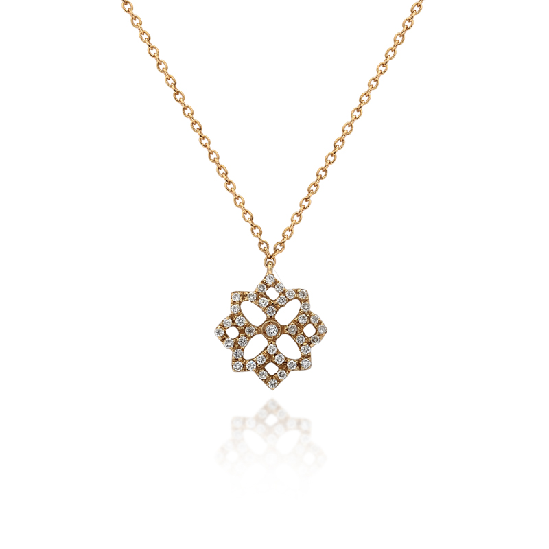 Collana in oro 750 con centro elemento traforato e incastonato in brillanti, totale ct 0,16